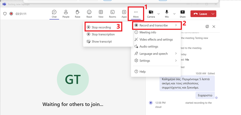 συνάντησης ενημερώνει όλους τους συμμετέχοντες με αυτόματο μήνυμα στο chat για το ποιος έχει απενεργοποιήσει την καταγραφή καθώς