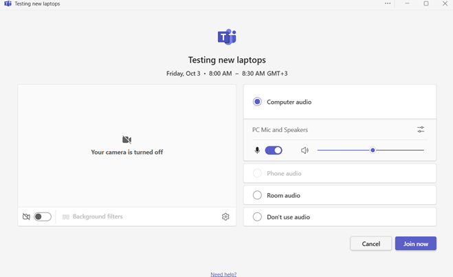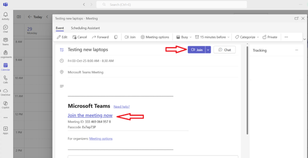 διπλό κλικ στη σύσκεψη και επιλέξτε είτε το Join πάνω δεξιά είτε το Join the meeting now στο κάτω μέρος της πρόσκλησης.