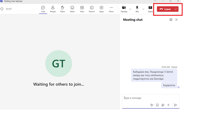 Πατώντας στο εικονίδιο Leave πάνω δεξιά, μπορείτε να αποχωρήσετε από τη συνάντηση.