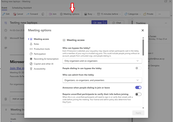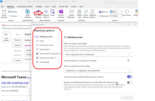 Για να δείτε τις επιλογές συνάντησης (Meeting Options) ανοίξτε τη συνάντηση